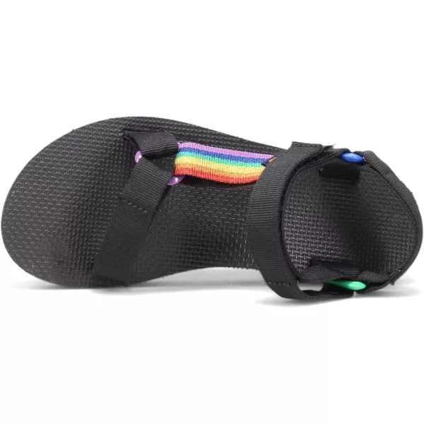 An asymmetrical update to our classic Pride Sandal, this high-shine remake showcases metallic, multi-colored straps that vary from left to right. Sporting a color-blocked outsole that celebrates the Pride flag’s call for inclusivity, this rainbow platform sandal utilizes REPREVE® polyester straps made from recycled plastic.